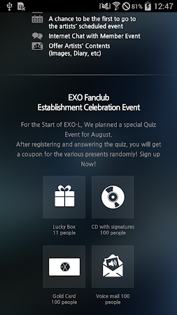 Hello, This is “EXO-L”, EXO’S GLOBAL OFFICAL FANCLUB. Sign up and finish a couple step-by-step missions to find huge benefits waiting for you. A mobile fanclub card, which can be used on various messages boards such as ‘Fan board’, ‘From Star’, etc, will be distributed to everyone who signs up. Install the application and join EXO-L.EXO-Lhttps://lh3.ggpht.com/Nq4qQ7KJiObuXEE02ntE3BizPbMROG6BSJb7GtemmVxy3BokspfIHMFxV_6MkfMY4NBK=w200http://bit.ly/2ADWlA7 Entertainment co. LtdEntertainmentEntertainment1.1.0November 29, 20184.4 and up5.06M4.6Rated for 3+1,000,000 - 2,000,000