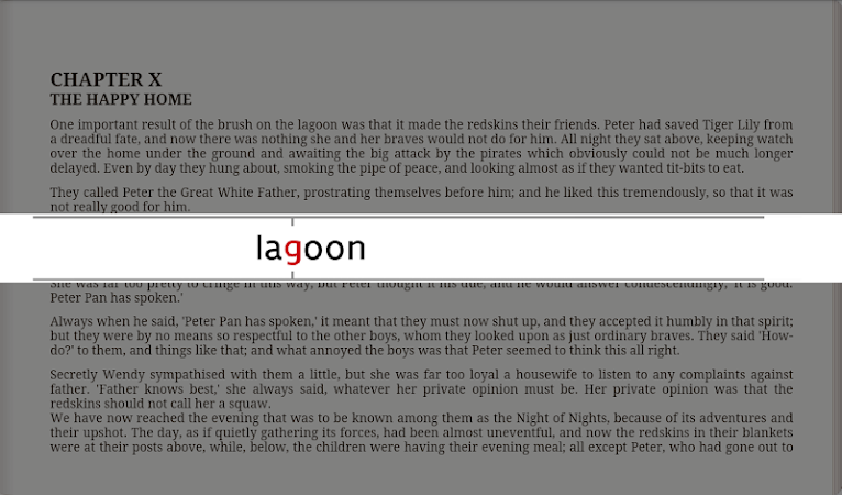 ### We also offer Spritz, an exciting new and popular tool for reading at lightning speed. Spritz makes speed reading available to anyone! It shows one word at a time with the Optical Recognition Point (ORP) highlighted in red so your eye don't have to move at all, making it possible to read at super speeds without any training (Think Neo in Matrix). About 80% of the time spent reading is used just moving your eyes finding the ORP.